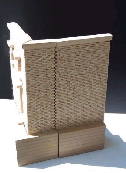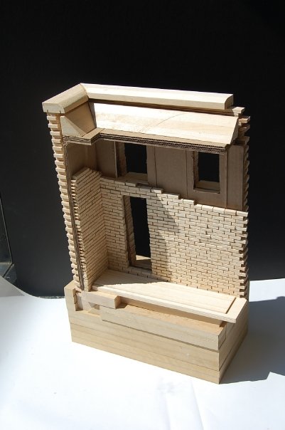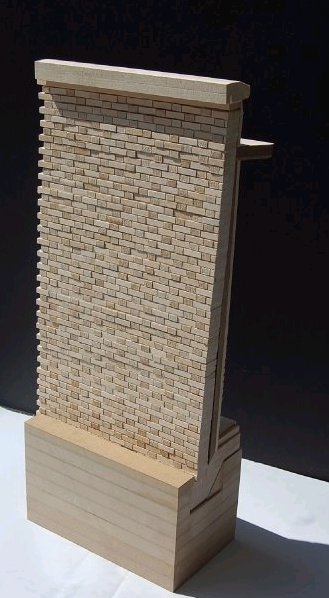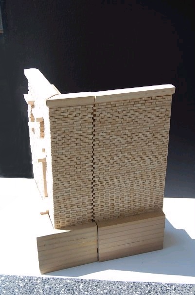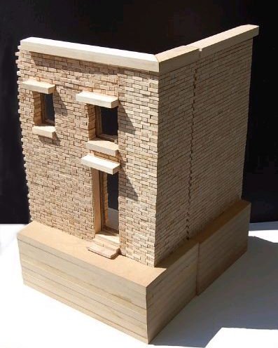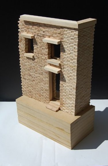 Description: Study the real construction of a brick building and recreate in wood model. These pictures actually show a phase 1 & 2 in which we first modeled a flat section and then had to make a second model of a corner which could attach to the first section.